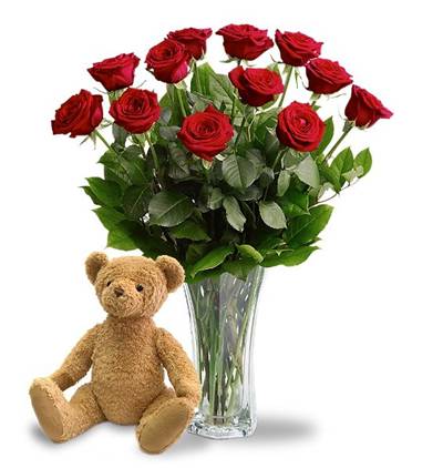 Vazoda 12 Kırmızı Gül ve Ayıcık